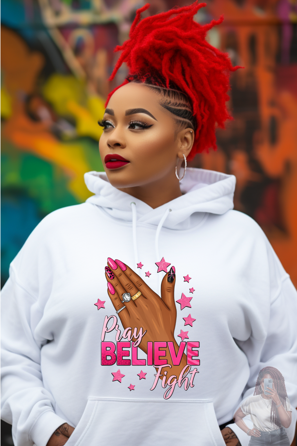 Stand strong, shine bright, and never stop fighting. This bold Breast Cancer Awareness design features a stylish hand with pink glam nails, sparkling rings, and the powerful message: Pray • Believe • Fight.